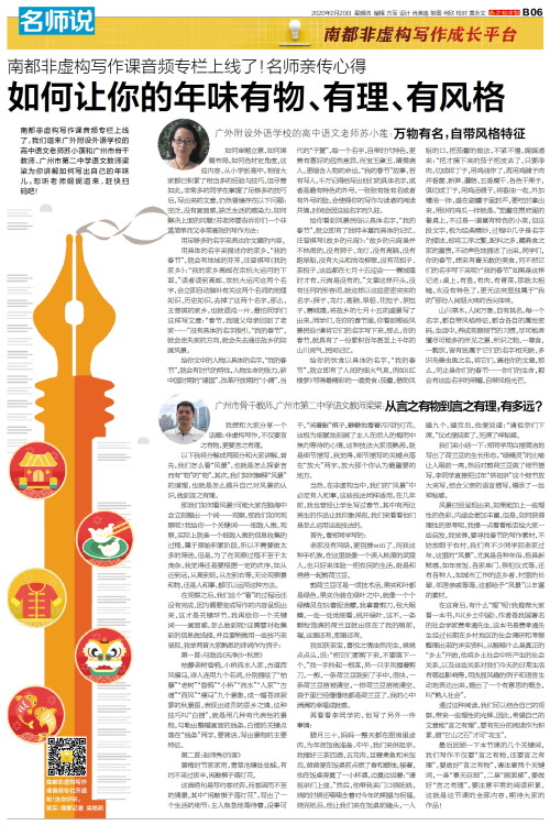 南都非虚构写作课音频专栏上线了,我们邀来广外附设外语学校的高中语文老师苏小莲和广州市骨干教师、广州市第二中学语文教师梁粱为你讲解如何写出自己的年味儿。想听老师娓娓道来,赶快扫码吧! 广外附设外语学校