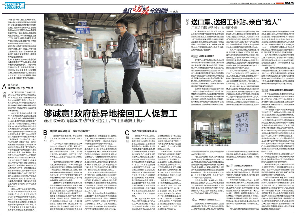 “两难”变“两全”,复工复产时不我待。目前,中山市疫情防控形势出现积极变化,每天新增确诊病例数持续控制在低位,治愈率高达6成以上,居全省前列。在这样的背景下,拥有众多民营企业的中山一直心系企业,自稳企