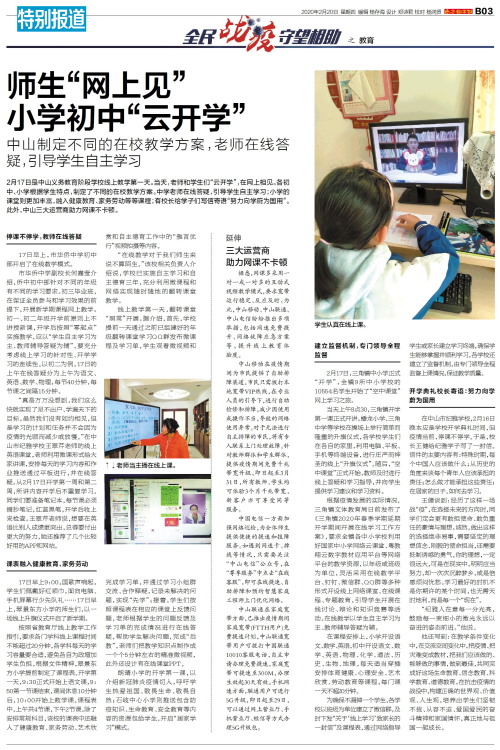 2月17日是中山义务教育阶段学校线上教学第一天。当天,老师和学生们“云开学”,在网上相见。各初中、小学根据学生特点,制定了不同的在校教学方案。中学老师在线答疑,引导学生自主学习;小学的课堂则更加丰富,