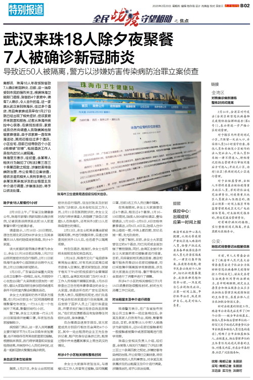 南都讯 珠海18人年夜饭聚餐致7人确诊新冠肺炎,日前,这一消息受到市民的强烈关注。根据珠海卫健部门通报,聚餐的4个家庭中,确有7人确诊。令人意外的是,这一家庭从武汉来到珠海后,住过多个酒店,而且有家庭成员早在1月27日就已经出现了相关症状,但该家庭并未就医和报告。记者从珠海市疾控中心获悉,在病情加重后,家庭成员仍然向调查人员隐瞒其他聚餐家庭信息。由于该家庭一直在珠海活动,其间还租住过多个酒店、小区住宅,目前已经导致四个小区4栋楼被“封楼”,包括酒店工作人员在内近50人被隔离。