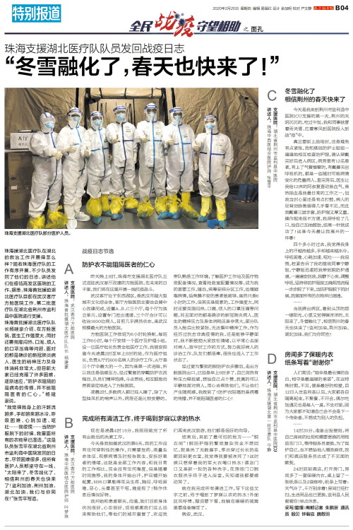 珠海援湖北医疗队在湖北的救治工作开展得怎么样?随着珠海医疗队的工作有序开展,不少队员发回了他们的日志,讲述他们在疫情高发区医院的工作。据悉,珠海首批援助湖北医疗队目前在武汉客厅方舱医院工作,第二批医疗