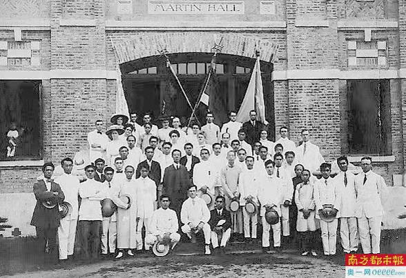 南都记者在建筑南立面左下角发现其墙体镶嵌着一块刻有“AD 1905”字样的岩石,岩石上面是一张老照片——那是1912年孙中山首次莅临岭南学堂时与学堂教职员在马丁堂前台阶的合影。