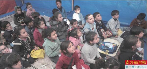 1月6日,学生们在加沙地带中部代尔拜拉赫的一处临时庇护所上课。