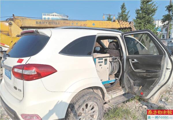 被查扣的“黑加油车”。这辆与普通私家车外观无异的SUV,打开车门,俨然是个小型加油站,后排座椅被拆除,加装了计价器、加油枪、储油胶罐。 南都记者 梁建忠 摄