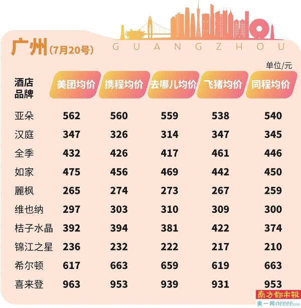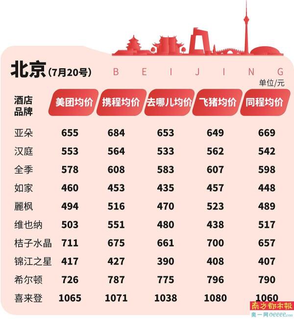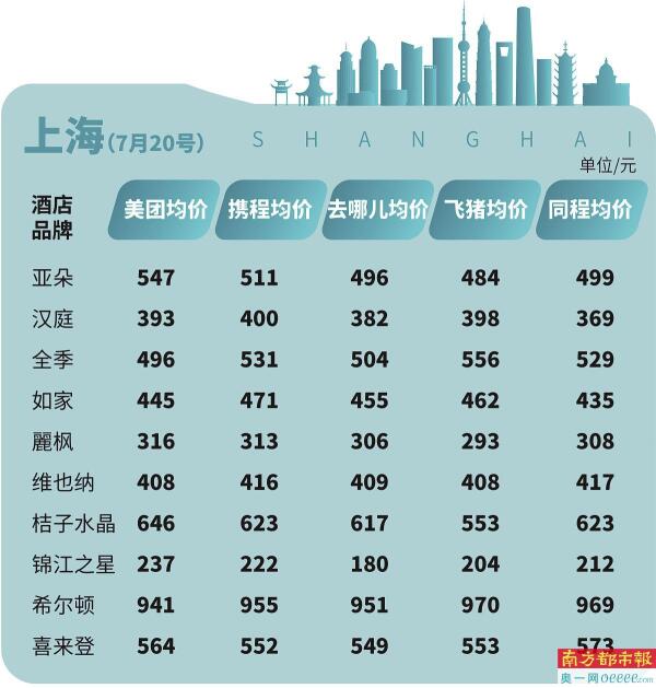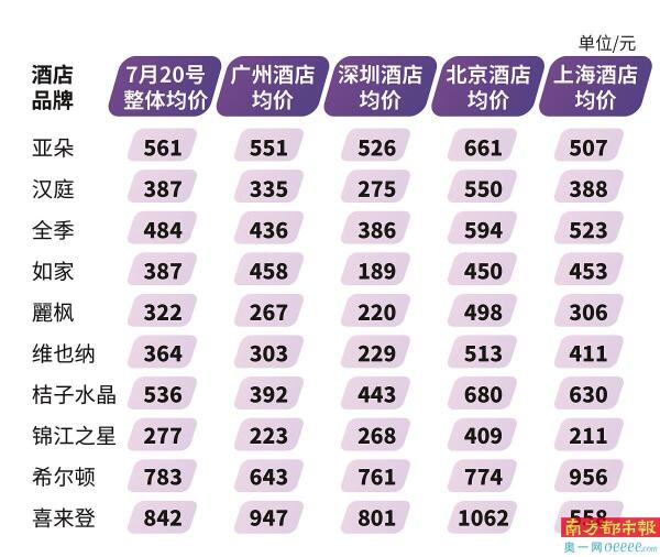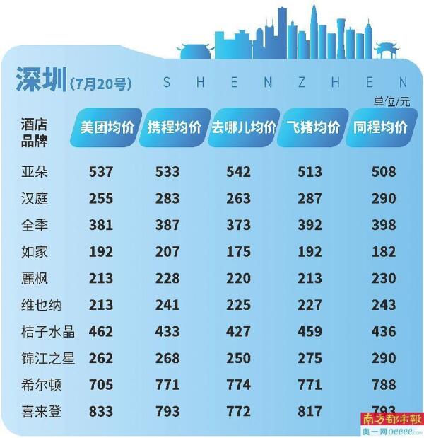 对此,南都鉴定评测实验室推出“酒店价格指数”,选择携程、去哪儿、同程旅行、飞猪、美团五大主流OTA平台的十大商务经济型酒店,包括亚朵、汉庭、全季、如家、麗枫、维也纳、桔子水晶、锦江之星、希尔顿、喜来登等商务连锁酒店价格进行测评,为消费者提供决策参考。