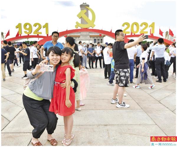 庆祝中国共产党成立100周年大会结束后,天安门广场庆祝景观7月2日至15日对外开放,吸引大批游客前往拍照。 新华社发