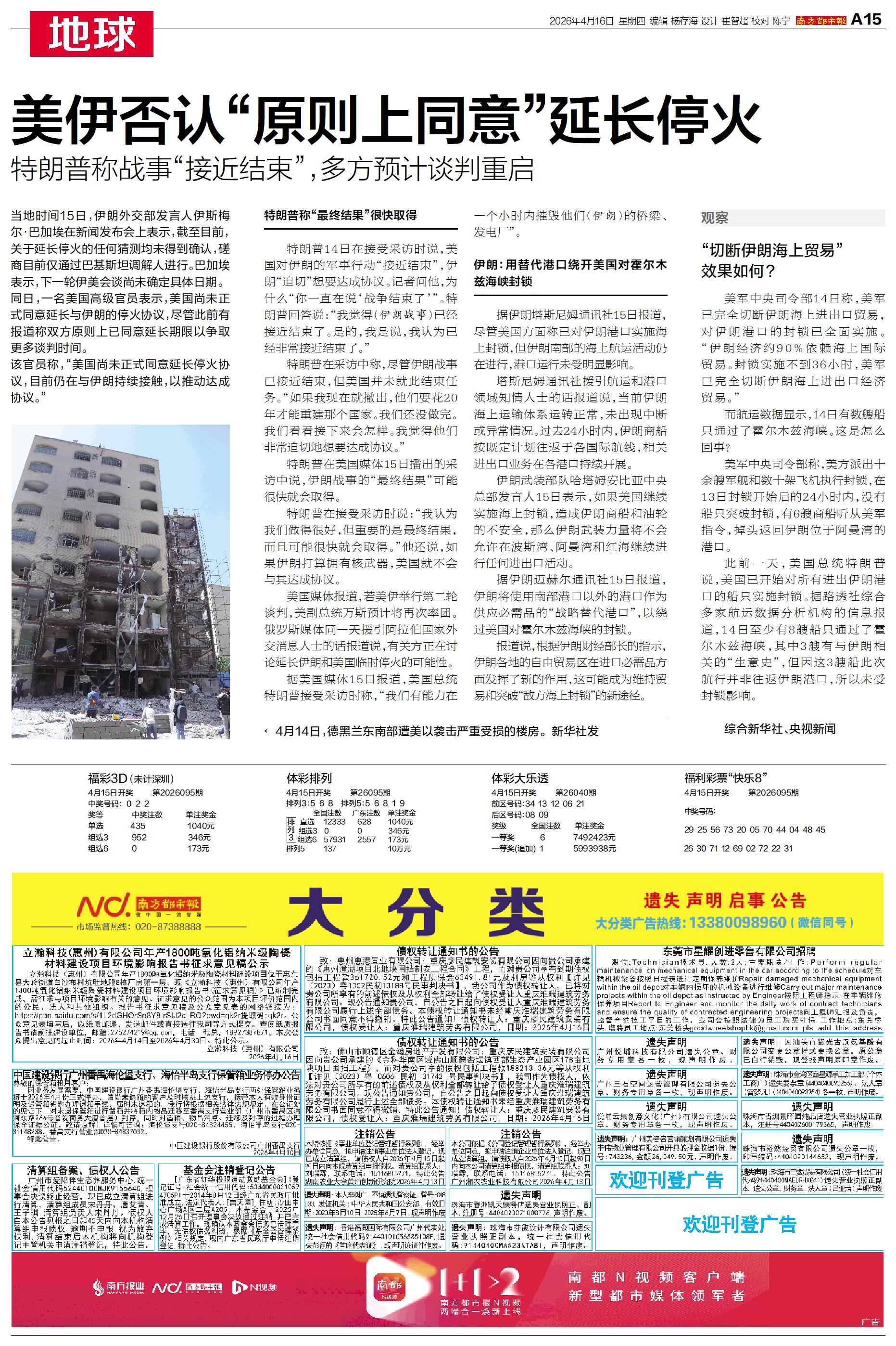 特朗普在美国媒体15日播出的采访中说,伊朗战事的“最终结果”可能很快就会取得。