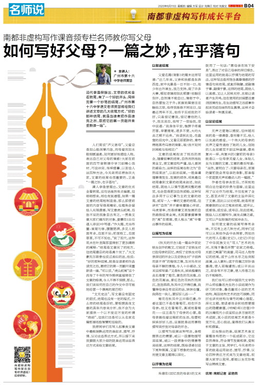 主讲人:广州市第十六中学老师黄慧清代李渔曾提出,文章的优劣全看煞尾。有了一个好的开头,同样需要一个妙笔的结尾。广州市第十六中学语文老师黄慧将给我们讲述文章的几大收尾方式,“好的那种结尾,就是当读者把作