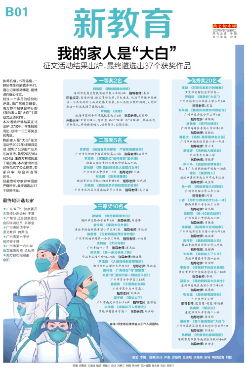 执笔抗疫,书写温情。一群妙笔生花的青少年们,用心记录感动事迹,用情谱作暖心作文。 经过一个多月的组织和评选,由广东省卫健委、南方都市报联合举行的《我的家人是“大白”主题征文