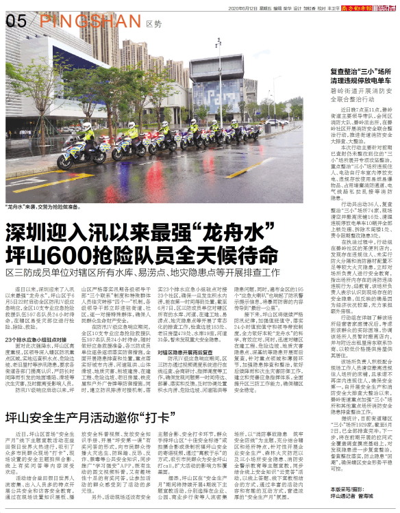 连日以来,深圳迎来了入汛以来最强“龙舟水”,坪山区于6月5日22时启动全区防汛IV级应急响应,全区10支专业应急抢险救援队伍597名队员24小时待命,在辖区易受灾部位进行检险、除险、救险。23个排水应