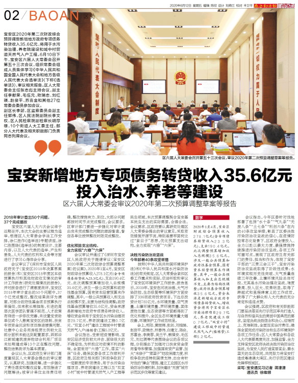 宝安区2020年第二次财政综合预算调整新增地方政府专项债务转贷收入35.6亿元,将用于水污染治理、养老院建设和城中村管道天然气入户工程。6月10日下午,宝安区六届人大常委会召开第五十三次会议,组织常委