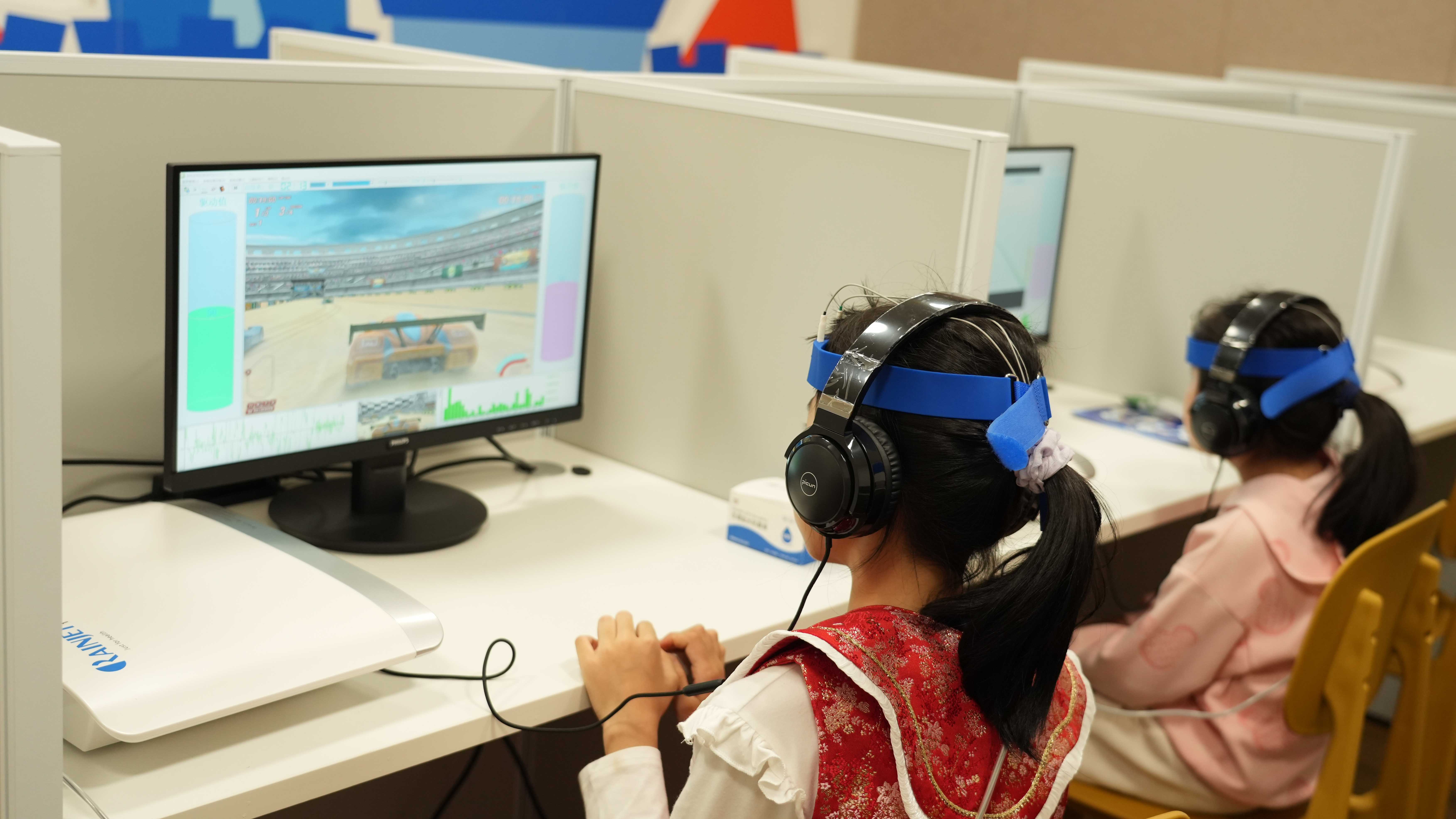 “大脑研究所”的教室里科技感满满。谢露露老师用酒精消毒巾擦拭设备后,轻轻为孩子佩戴在额头上,引导他们只要集中注意力,就能让游戏中的赛车高速冲向终点。15分钟挑战结束后,测评系统将得出科学评估,并有老师第一时间解读测评结果。