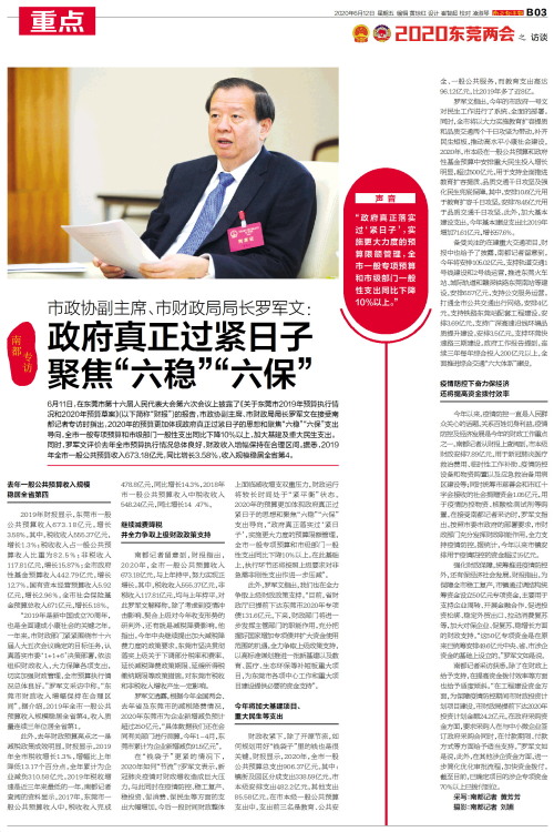 南都专访6月11日,在东莞市第十六届人民代表大会第六次会议上披露了《关于东莞市2019年预算执行情况和2020年预算草案》(以下简称“财报”)的报告,市政协副主席、市财政局局长罗军文在接受南都记者
