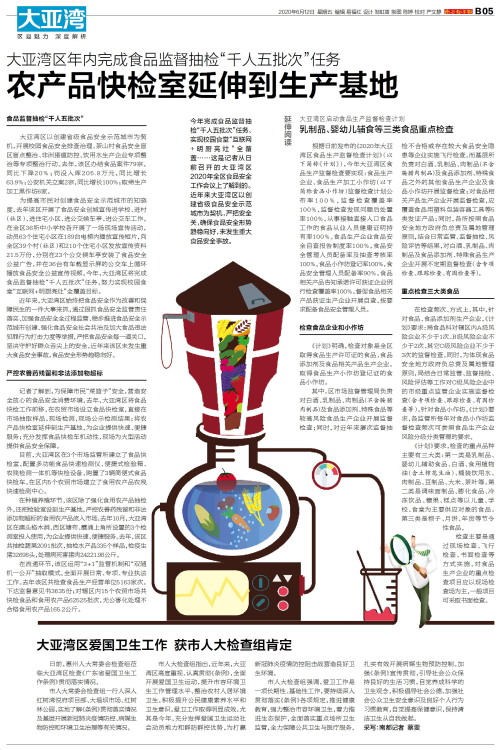 今年完成食品监督抽检“千人五批次”任务、实现校园食堂“互联网+明厨亮灶”全覆盖……这是记者从日前召开的大亚湾区2020年全区食品安全工作会议上了解到的。近年来大亚湾区以创建省级食品安全示范城市为契机,