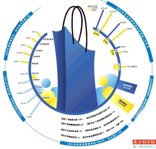 南都讯 3月12日,金湾区召开“3·15”消费维权新闻发布会,发布了2020年度消费维权情况。南都记者从发布会上获悉,2020年,金湾通过12315、12345热线及信函、来访投诉等多种渠道,共受理消费者投诉、举报3959宗,数量与2019年同比增长79.87%。按时办结率为100%,群众满意率为98.28%,共为消费者挽回经济损失870.57万元。