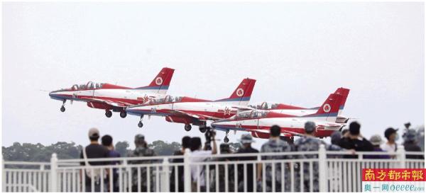 9月26日下午,“红鹰”飞行表演队的“教-8”飞机从跑道上空掠过。 南方日报记者 关铭荣 摄
