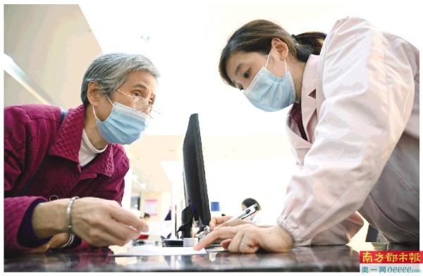 福建省三明市第一医院的医保办工作人员(右)向前来咨询药品报销问题的居民讲解相关政策(2020年11月18日摄)。