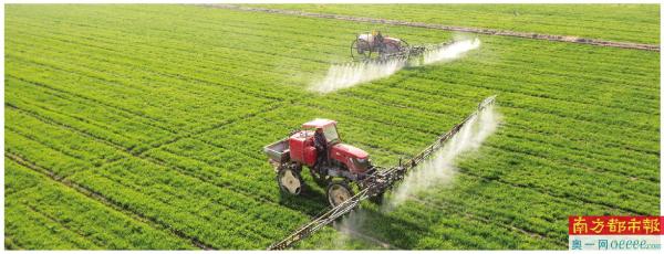 2022年3月9日,在江苏省海安市大公镇贲集村,村民驾驶植保机械在小麦田间进行喷洒药物作业(无人机照片)。