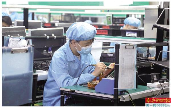 东莞市爱培科电子有限公司车间内,工人们熟练操作设备,忙碌不停。 通讯员 朗宣 摄
