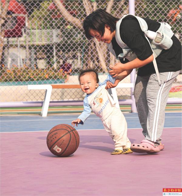 冬天的阳光下,一位母亲在篮球场教孩子走路。 南都拍客 孙惠红 摄