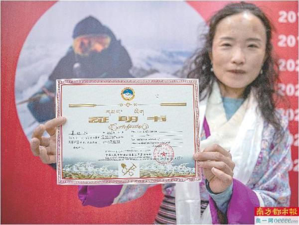 董红娟展示希夏邦马峰登顶证书(4月29日摄)。