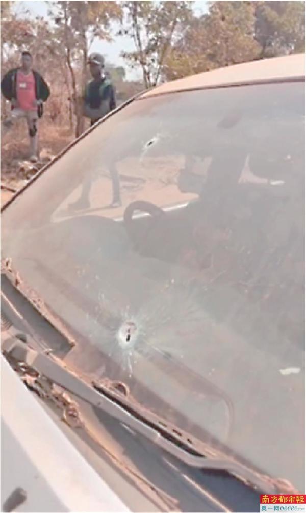 据华商会披露,二人分别头部和腹部中枪,车上用于检测矿的矿枪和若干现金也被抢劫一空。南都记者从张先生提供的现场画面看到,二人驾驶的银色轿车挡风玻璃上有多处子弹穿过的痕迹,引擎盖上也留下了多处弹孔。