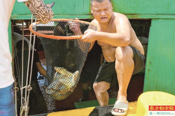 8月16日,珠海洪湾中心渔港,渔民将鱼送上岸。 南都拍客 陈萍 摄