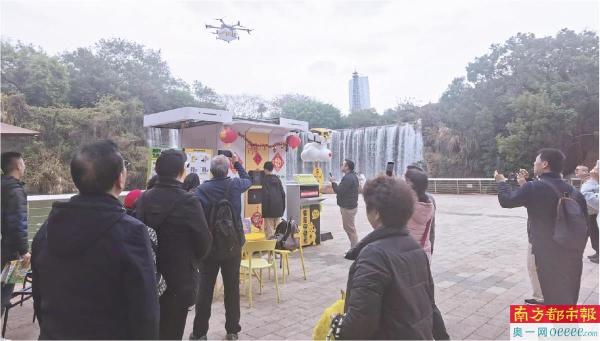 春节期间,世界之窗、人才公园游客体验无人机外卖。