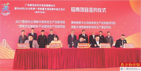 《报告》对中山等市的优化营商环境工作“点名表扬”。这是上月底广东板芙经济开发区揭牌暨中山市2024年一季度重大项目集中动工仪式现场,4个项目签约,总投资额达53亿元。 南都记者 吴进 摄