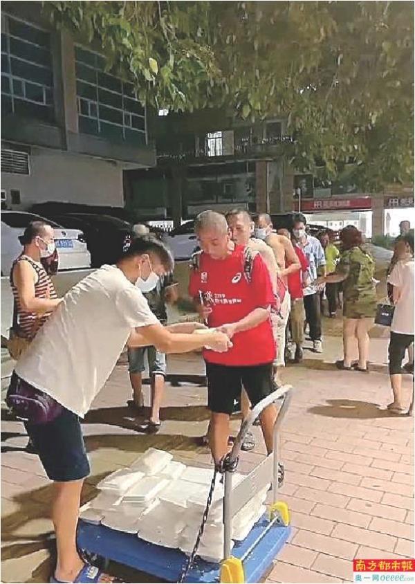 去年夏天,老朱和儿子到街上向困难群众免费派饭。 受访者供图