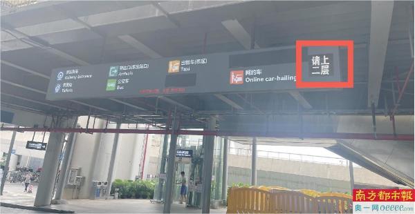 佛山西站东区停车场,此前向左指的箭头已经更换为“请上二层”的提示。