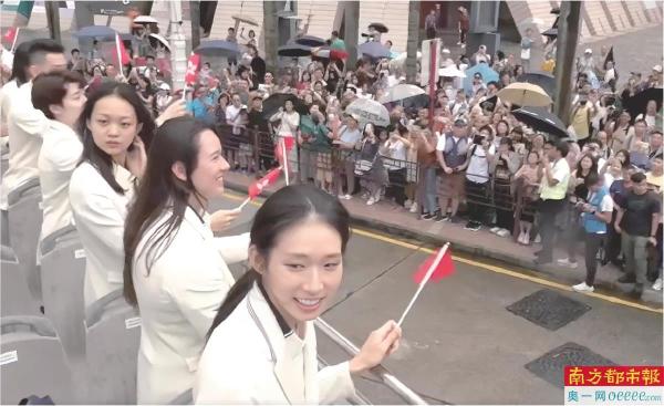 南都、N视频记者了解到,尽管在巡游当天,香港天气不佳,偶尔有阵雨,但运动员、教练员与其他工作人员风雨无阻,分别搭乘两辆敞篷巴士,按预定行程出发。负责搭载中国香港奥运代表团的敞篷双层巴士,车头印有“健儿凯旋归港,我们深以为傲”的字样,以及香港特别行政区区徽。