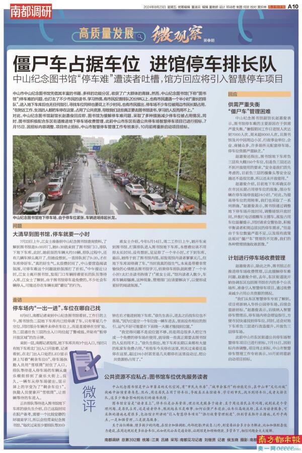 8月23日,南都报道了中山纪念图书馆读者停车难问题,引发了社会关注。
