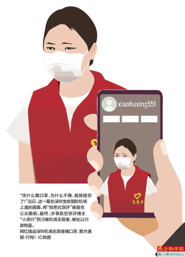 近日,航空测评网红“小虎行”酒后在深圳宝安国际机场指责一名女性志愿者戴口罩,并扬言要亲自动手摘除,最终被深圳警方依法行政拘留。