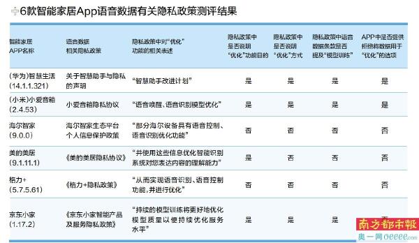 南都记者实测华为智慧生活、小米小爱音箱、海尔智家、美的美居、格力+、京东小家六个智能家居App的个人隐私政策,发现它们的语音数据相关条款中均提到了需要收集用户语音数据,且数据将会用于语音识别、功能的“优化”。不过,部分App对于具体优化什么,语焉不详。