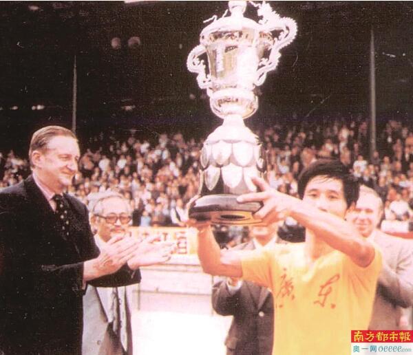 1979年,广东队队长何佳在香港捧起首届省港杯冠军奖杯。