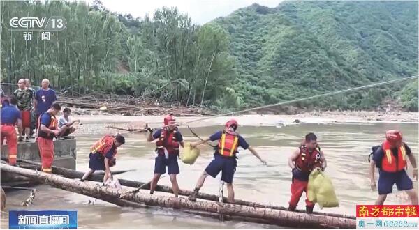 为了方便把受困人员转移出来,消防救援人员在断路处就地取材,用断木和绳索快速架起一座木桥。 央视截图