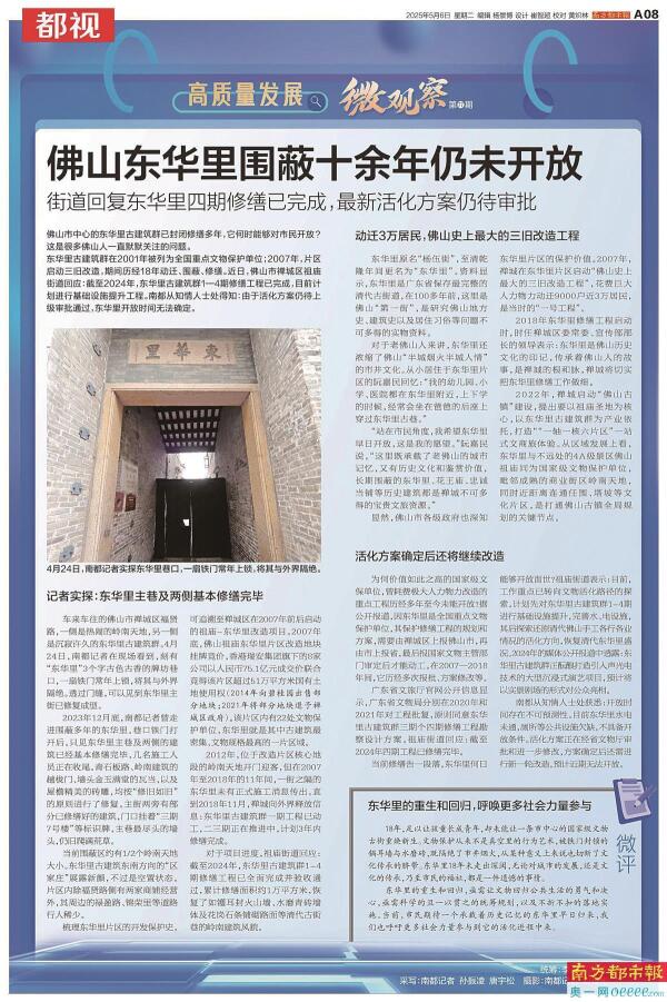 南都还借助微观察栏目主动深挖,将佛山国家级文保单位东华里“久蔽不开”的“顽疾”摆到聚光灯之下,发问:“如何守护历史文脉和文化记忆?”5月6日,南都刊发《佛山东华里围蔽十余年仍未开放》,赢得读者、同行和行业内专家点赞。一纸报道,促成了项目加速活化、文旅项目签约,实现东华里阶段性开放。