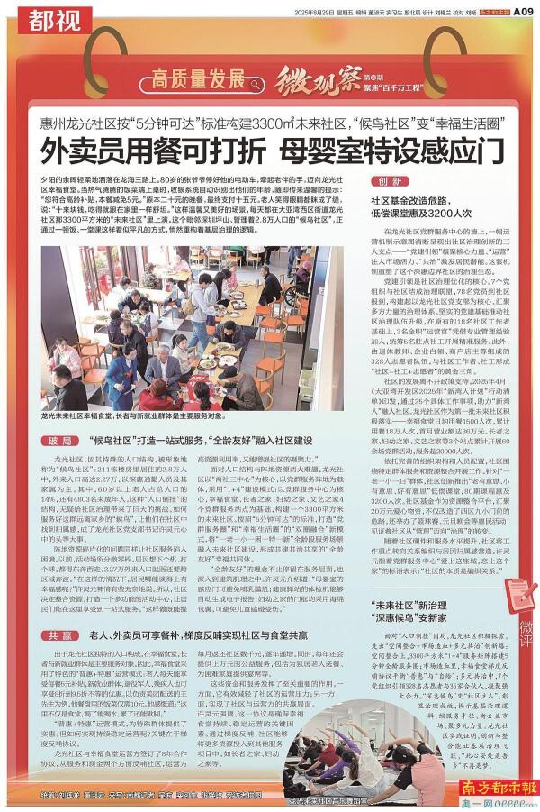 外来人口大量聚集、区域人口老龄化严重、“年龄倒挂”问题显著……惠州大亚湾龙光社区因特殊的人口结构,被形象地称为“候鸟社区”。微观察报道《外卖员用餐可打折 母婴室特设感应门》中,展示了面对这样巨大的挑战,社区治理应该如何去做。按照“5分钟可达”的标准,龙光社区将“一老一小一困一特一新”全龄段服务场景融入未来社区建设,形成了共建共治共享的“全龄友好”幸福共同体。