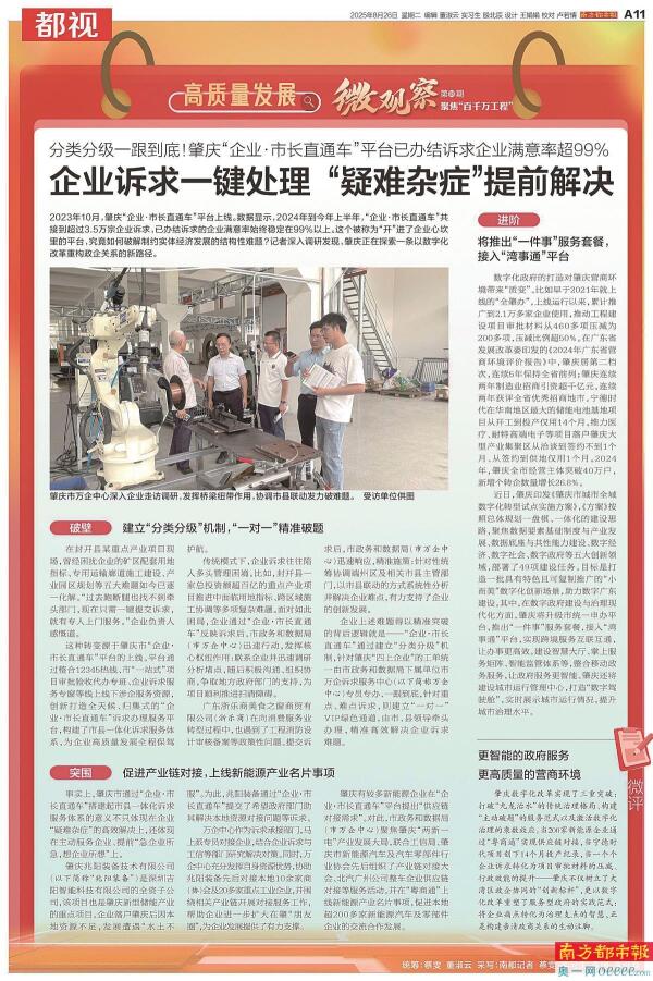 2023年10月,肇庆“企业·市长直通车”平台上线。数据显示,2024年到今年上半年,“企业·市长直通车”共接到超过3.5万宗企业诉求,已办结诉求的企业满意率始终稳定在99%以上。8月26日,南都刊发《企业诉求一键处理“疑难杂症”提前解决》,深入剖析了这个被称为“开”进了企业心坎里的平台,究竟如何破解制约实体经济发展的结构性难题。