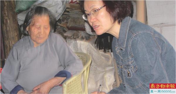 南香红(右)在浙江义乌的崇山村采访侵华日军细菌战受害者的当地村民。
