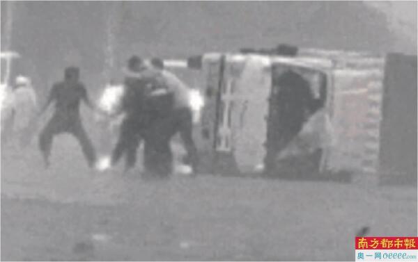 货车被强风刮倒 湛江交警路人组“人墙”挡风