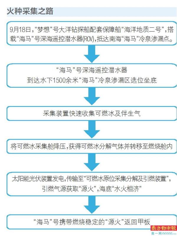 2024年7月,广州海洋地质调查局牵头成立科技攻关团队,联合浙江大学、东海实验室、广东万家乐燃气具有限公司以及高景太阳能股份有限公司等多家优势力量,制定了详细的实施方案和清晰的技术路线,研发了基于“海马”号的“源火”采集装置,先后完成水池试验及搭载平台码头联调;2025年5月3日-4日,“海洋地质二号”船搭载的“海马”号集成“源火”采集装置两次下潜至南海北部海域水深1500多米处,成功实现了深海“源火”引燃,验证了“源火”引燃方案的可行性和装备的可靠性。