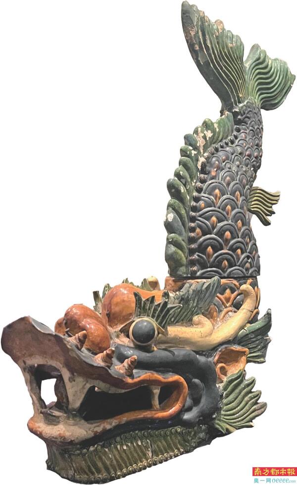 近日开展的广东省博物馆“百年湾区情——粤港澳大湾区近现代文物展”上,也展示了有鳌鱼形象的文物——清光绪石湾窑花鸟瓜果少狮太狮瓦脊。