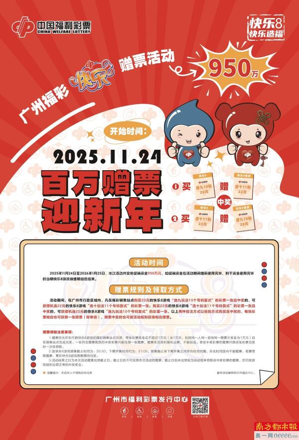 为真情回馈广大购彩者,广州市福利彩票发行中心将自11月24日起,在全市范围内开展快乐8游戏“百万赠票迎新年”促销活动。