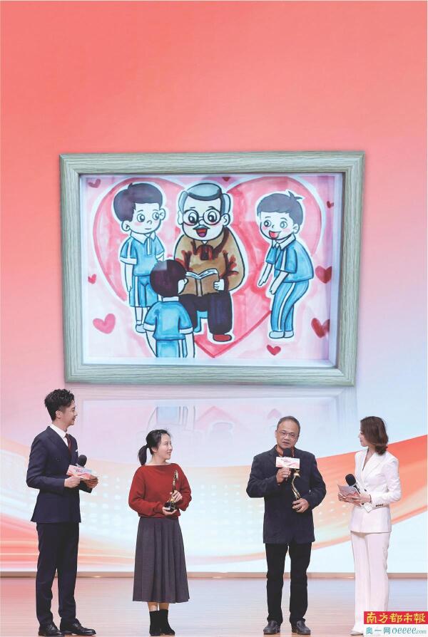1月9日,深圳市宝安区湖东小学校长郑艳峰来到广东“微文明之星”致敬礼现场,其因“放学陪小学生等家长”而走红。活动现场展示了一幅郑艳峰的学生手绘作品,描绘的正是校长“陪等”的动人场景。 南都记者 钟锐钧 摄