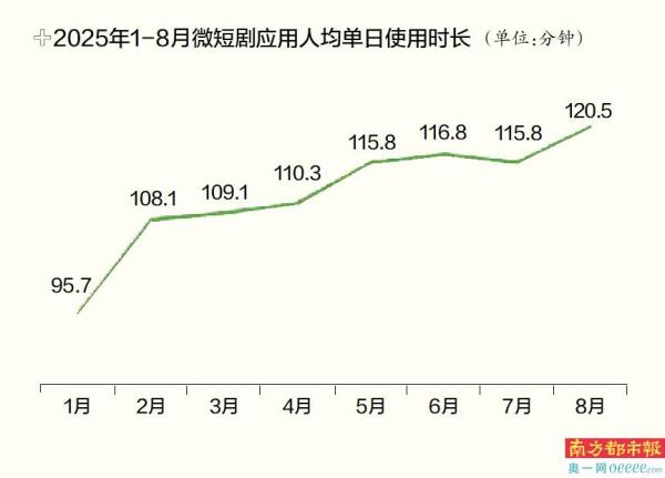微短剧数据平台DataEye的数据显示,截至2025年6月,全国微短剧用户规模达6.96亿,占网民总数比重接近七成。中国网络视听节目服务协会发布的《中国微短剧行业发展白皮书(2025)》显示,2025年1-8月,微短剧应用的人均单日使用时长达120.5分钟,较1月增幅达25.9%。调研中,近八成受访用户表示,观看微短剧的频率较2024年有进一步提升。