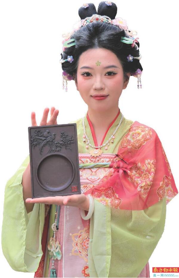 志愿者着汉服展示肇庆端砚。