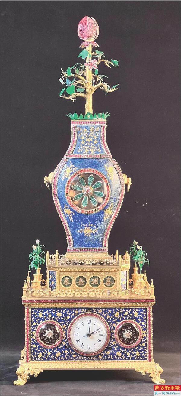 清代变花变字嵌宝石铜胎掐丝珐琅瓶式钟,集乾隆时期广钟技艺之大成,整点报时会呈现转花、换吉语等精巧效果,寓意平安喜乐、花开富贵。据吴凌云馆长介绍,这座钟乃300年前的广州工匠精心打造,当年作为贡品进献乾隆皇帝,20世纪50年代,故宫博物院将这件文物调拨至广州博物馆。“前几年馆方特邀北京故宫博物院的修复师傅对其进行了专业修缮,如今这件文物仍能正常发声,成为文物留存与展陈的经典案例。”
