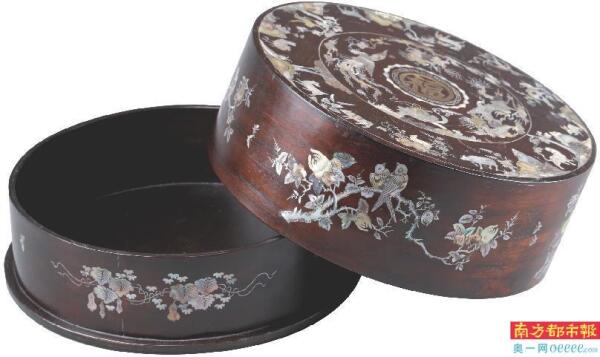 清代红木镶嵌螺钿十二生肖纹圆盒。